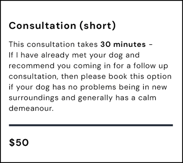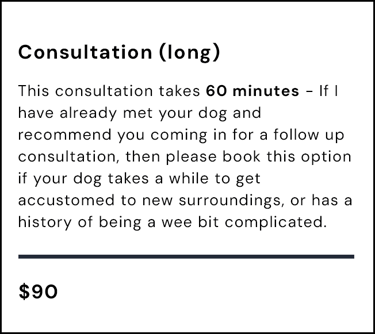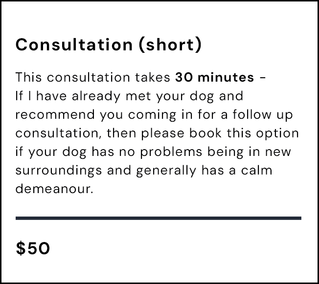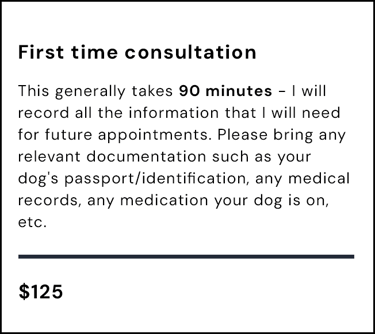 Allow up to 90 minutes for your first appointment with me. I can not perform any massage before I know about your dog's past and medical treatment, diagnosed conditions, and which signs for massage you have observed.